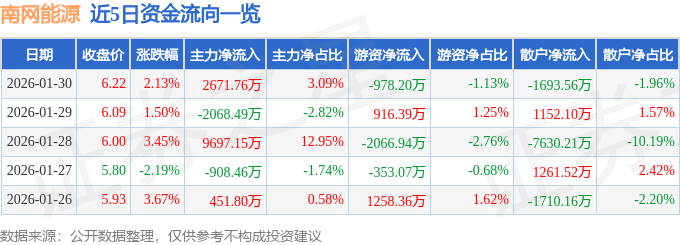 证券之星消息,截至2026年1月30日收盘,南网能源(003035)报收于6.22元,上涨2.13%,换手率3.77%,成交量142.85万手,成交额8.63亿元。