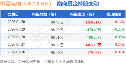 证券之星消息,1月30日南向资金增持1360.21万股中国电信(00728.HK)。近5个交易日中,获南向资金减持的有2天,累计净减持261.81万股。近20个交易日中,获南向资金减持的有13天,累计净减持1.4亿股。截至目前,南向资金持有中国电信(00728.HK)98.4亿股,占公司已发行普通股的70.9%。