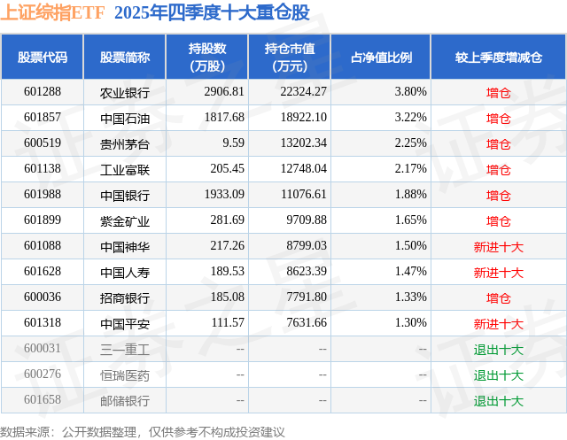 上证综指ETF基金成立于2011年1月30日,基金经理为王保合 方旻,基金跟踪标的为上证综合指数,成立以来超额回报为68.58%,近一个月超额回报为0.45%。最新披露的基金持仓数据显示,截止2025年12月31日,该基金第一大重仓股为农业银行(601288),持股占比为3.8%。