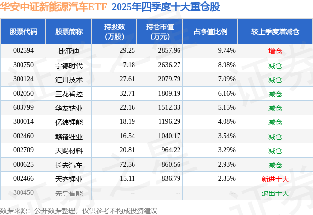 华安中证新能源汽车ETF基金成立于2021年2月3日,基金经理为刘璇子,基金跟踪标的为中证新能源汽车指数,成立以来超额回报为11.39%,近一个月超额回报为-0.02%。最新披露的基金持仓数据显示,截止2025年12月31日,该基金第一大重仓股为比亚迪(002594),持股占比为9.74%。