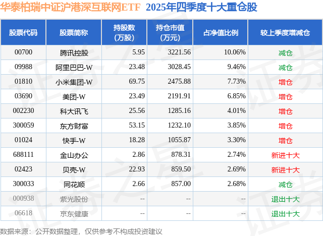 华泰柏瑞中证沪港深互联网ETF基金成立于2021年1月25日,基金经理为尤家妤,基金跟踪标的为中证沪港深互联网人民币指数,成立以来超额回报为11.7%,近一个月超额回报为-0.24%。最新披露的基金持仓数据显示,截止2025年12月31日,该基金第一大重仓股为腾讯控股(00700),持股占比为10.06%。