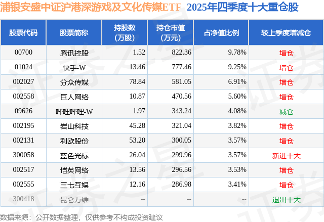 浦银安盛中证沪港深游戏及文化传媒ETF基金成立于2021年11月25日,基金经理为罗雯,基金跟踪标的为中证沪港深游戏及文化传媒指数,成立以来超额回报为-49.77%,近一个月超额回报为0.07%。最新披露的基金持仓数据显示,截止2025年12月31日,该基金第一大重仓股为腾讯控股(00700),持股占比为9.78%。