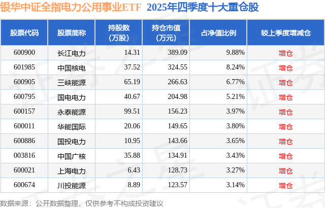 银华中证全指电力公用事业ETF基金成立于2022年6月30日,基金经理为谭跃峰,基金跟踪标的为中证全指电力与电网指数,成立以来超额回报为-0.95%,近一个月超额回报为-0.05%。最新披露的基金持仓数据显示,截止2025年12月31日,该基金第一大重仓股为长江电力(600900),持股占比为9.88%。
