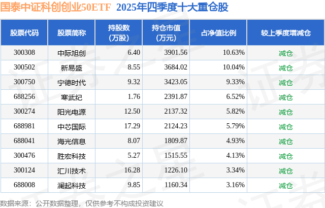 国泰中证科创创业50ETF基金成立于2021年6月29日,基金经理为黄岳,基金跟踪标的为中证科创创业50指数,成立以来超额回报为9.89%,近一个月超额回报为0.17%。最新披露的基金持仓数据显示,截止2025年12月31日,该基金第一大重仓股为中际旭创(300308),持股占比为10.63%。