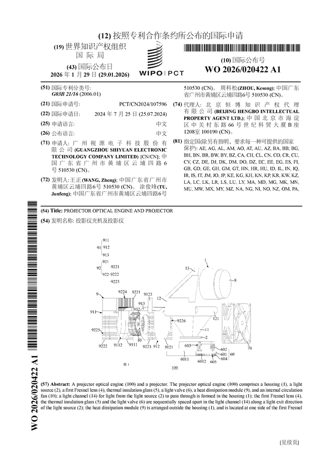 证券之星消息,根据企查查数据显示视源股份(002841)公布了一项国际专利申请,专利名为“投影仪光机及投影仪”,专利申请号为PCT/CN2024/107596,国际公布日为2026年1月29日。