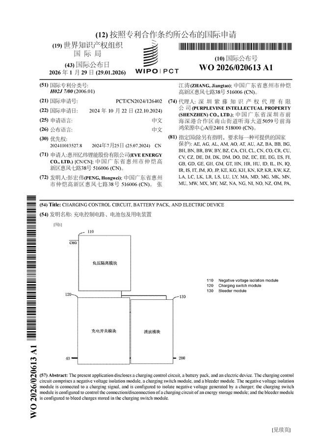 证券之星消息,根据企查查数据显示亿纬锂能(300014)公布了一项国际专利申请,专利名为“充电控制电路、电池包及用电装置”,专利申请号为PCT/CN2024/126402,国际公布日为2026年1月29日。