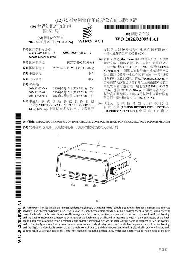证券之星消息,根据企查查数据显示安克创新(300866)公布了一项国际专利申请,专利名为“充电器、充电控制电路、充电器的控制方法以及存储介质”,专利申请号为PCT/CN2025/098068,国际公布日为2026年1月29日。