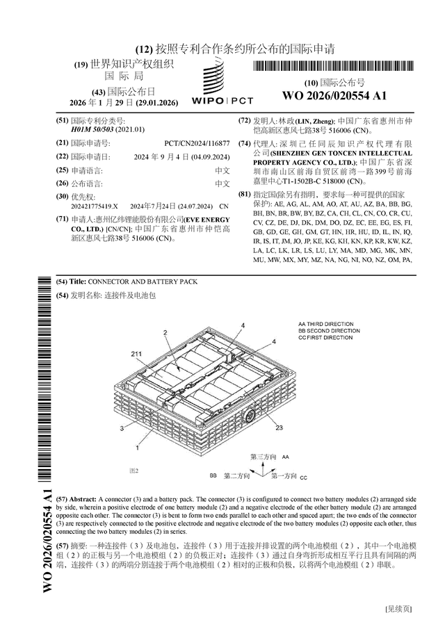 证券之星消息,根据企查查数据显示亿纬锂能(300014)公布了一项国际专利申请,专利名为“连接件及电池包”,专利申请号为PCT/CN2024/116877,国际公布日为2026年1月29日。