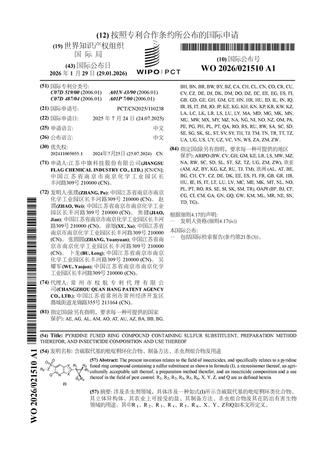 证券之星消息,根据企查查数据显示中旗股份(300575)公布了一项国际专利申请,专利名为“含硫取代基的吡啶稠环化合物、制备方法、杀虫剂组合物及用途”,专利申请号为PCT/CN2025/110238,国际公布日为2026年1月29日。