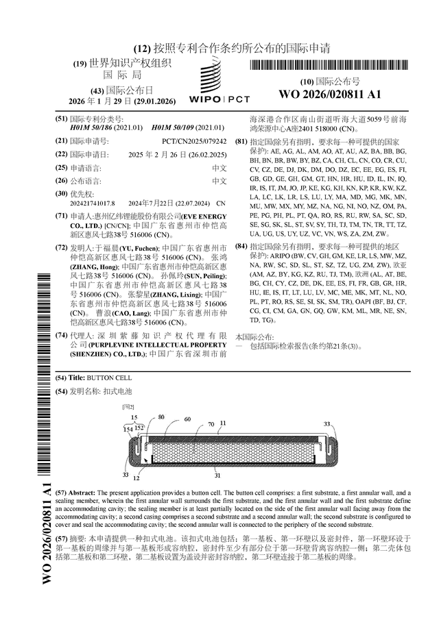 证券之星消息,根据企查查数据显示亿纬锂能(300014)公布了一项国际专利申请,专利名为“扣式电池”,专利申请号为PCT/CN2025/079242,国际公布日为2026年1月29日。