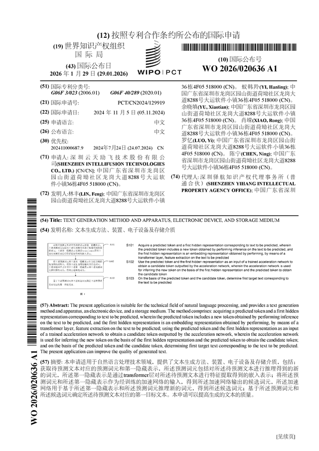 证券之星消息,根据企查查数据显示云天励飞(688343)公布了一项国际专利申请,专利名为“文本生成方法、装置、电子设备及存储介质”,专利申请号为PCT/CN2024/129919,国际公布日为2026年1月29日。