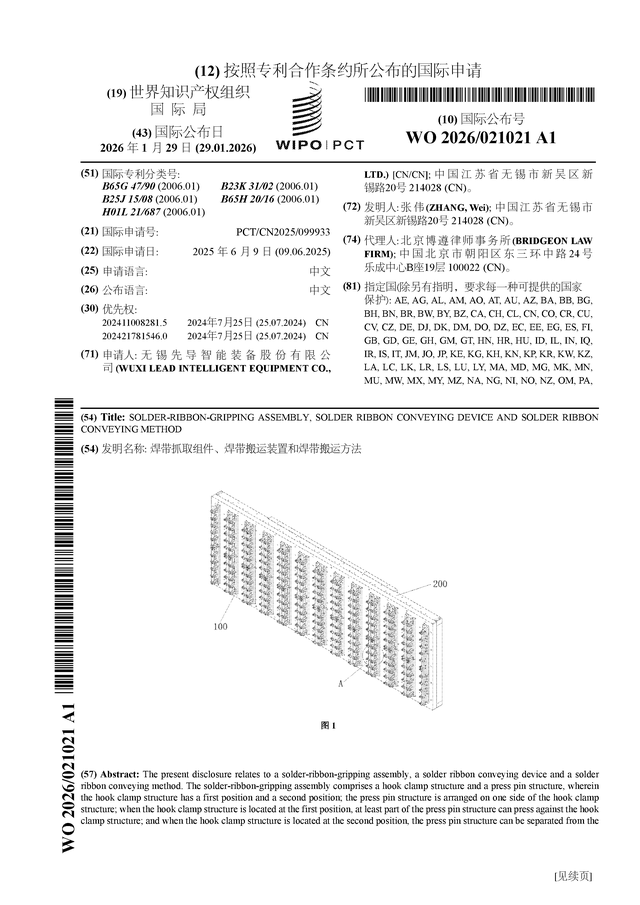 证券之星消息,根据企查查数据显示先导智能(300450)公布了一项国际专利申请,专利名为“焊带抓取组件、焊带搬运装置和焊带搬运方法”,专利申请号为PCT/CN2025/099933,国际公布日为2026年1月29日。