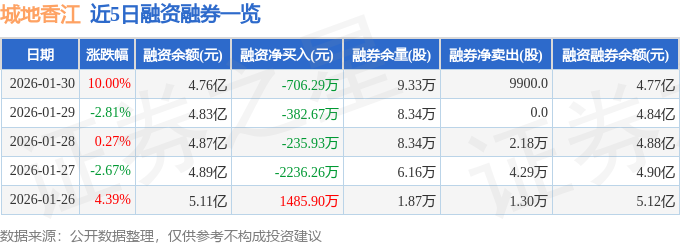 证券之星消息,截至2026年1月30日收盘,城地香江(603887)报收于15.62元,上涨10.0%,涨停,换手率7.6%,成交量45.22万手,成交额6.96亿元。