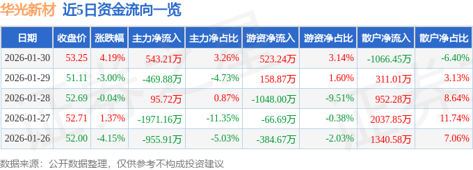 证券之星消息,截至2026年1月30日收盘,华光新材(688379)报收于53.25元,上涨4.19%,换手率3.52%,成交量3.17万手,成交额1.67亿元。
