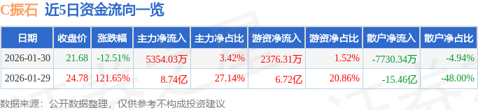 证券之星消息,截至2026年1月30日收盘,C振石(601112)报收于21.68元,下跌12.51%,换手率39.84%,成交量70.61万手,成交额15.66亿元。