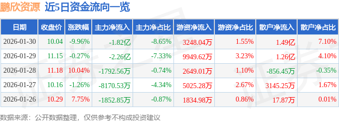 证券之星消息,截至2026年1月30日收盘,鹏欣资源(600490)报收于10.04元,下跌9.96%,跌停,换手率10.21%,成交量203.53万手,成交额21.01亿元。