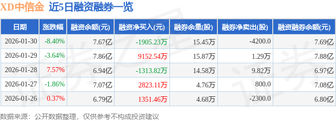 XD中信金融资融券信息显示,融资方面,当日融资买入7457.34万元,融资偿还9362.57万元,融资净偿还1905.23万元。融券方面,融券卖出2.24万股,融券偿还2.66万股,融券余量15.45万股,融券余额230.82万元。融资融券余额7.69亿元。