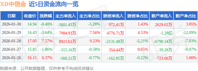 证券之星消息,截至2026年1月30日收盘,XD中信金(601061)报收于14.94元,下跌8.4%,换手率9.04%,成交量45.29万手,成交额6.82亿元。