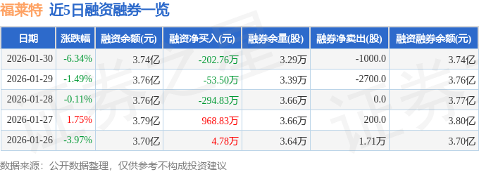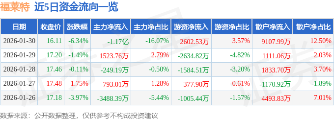 证券之星消息,截至2026年1月30日收盘,福莱特(601865)报收于16.11元,下跌6.34%,换手率2.37%,成交量45.04万手,成交额7.29亿元。