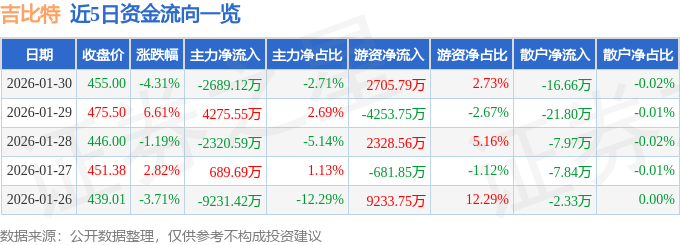 证券之星消息,截至2026年1月30日收盘,吉比特(603444)报收于455.0元,下跌4.31%,换手率3.01%,成交量2.17万手,成交额9.92亿元。
