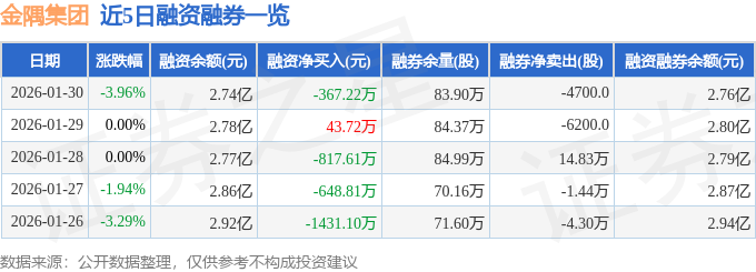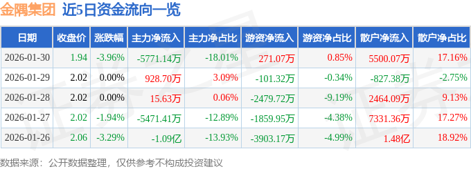 证券之星消息,截至2026年1月30日收盘,金隅集团(601992)报收于1.94元,下跌3.96%,换手率1.97%,成交量164.28万手,成交额3.21亿元。