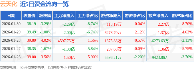 证券之星消息,截至2026年1月30日收盘,云天化(600096)报收于38.19元,下跌3.29%,换手率3.76%,成交量68.5万手,成交额26.13亿元。