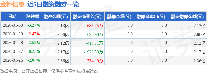 金桥信息融资融券信息显示,融资方面,当日融资买入3691.88万元,融资偿还3005.13万元,融资净买入686.75万元。融券方面,融券卖出0.0股,融券偿还0.0股,融券余量0.0股,融券余额0.0万元。融资融券余额2.13亿元。