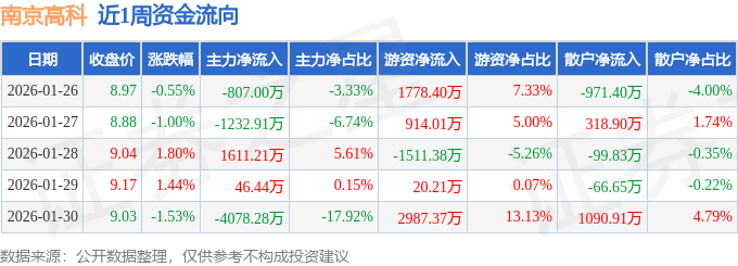 资金流向数据方面,本周南京高科主力资金合计净流出4460.54万元,游资资金合计净流入4188.6万元,散户资金合计净流入271.93万元。本周资金流向一览见下表: