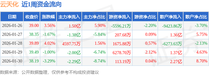 资金流向数据方面,本周云天化主力资金合计净流出3.7亿元,游资资金合计净流入2679.25万元,散户资金合计净流入3.43亿元。本周资金流向一览见下表: