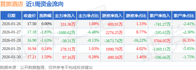 资金流向数据方面,本周首旅酒店主力资金合计净流出1004.09万元,游资资金合计净流入602.71万元,散户资金合计净流入401.38万元。本周资金流向一览见下表: