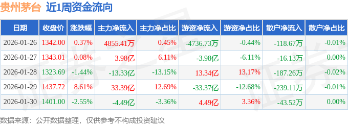 资金流向数据方面,本周贵州茅台主力资金合计净流入20.04亿元,游资资金合计净流出19.98亿元,散户资金合计净流出604.7万元。本周资金流向一览见下表: