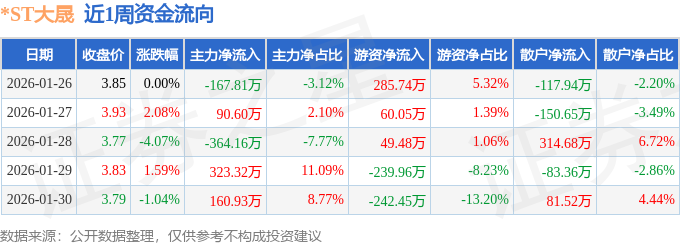 资金流向数据方面,本周*ST大晟主力资金合计净流入42.88万元,游资资金合计净流出87.13万元,散户资金合计净流入44.25万元。本周资金流向一览见下表: