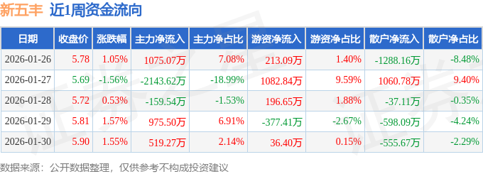 资金流向数据方面,本周新五丰主力资金合计净流入266.68万元,游资资金合计净流入1151.57万元,散户资金合计净流出1418.26万元。本周资金流向一览见下表:
