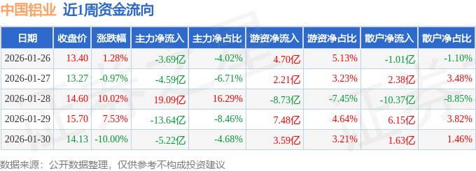 资金流向数据方面,本周中国铝业主力资金合计净流出8.04亿元,游资资金合计净流入9.25亿元,散户资金合计净流出1.21亿元。本周资金流向一览见下表: