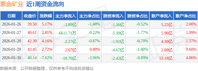 资金流向数据方面,本周紫金矿业主力资金合计净流出15.02亿元,游资资金合计净流出15.67亿元,散户资金合计净流入30.69亿元。本周资金流向一览见下表: