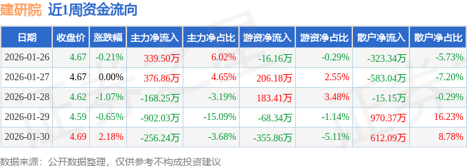 资金流向数据方面,本周建研院主力资金合计净流出610.16万元,游资资金合计净流出50.77万元,散户资金合计净流入660.93万元。本周资金流向一览见下表: