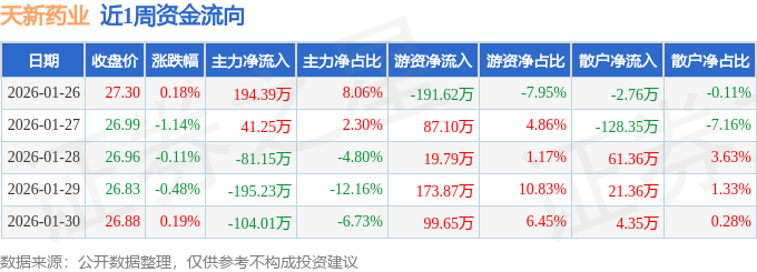 证券之星消息,截至2026年1月30日收盘,天新药业(603235)报收于26.88元,较上周的27.25元下跌1.36%。本周,天新药业1月27日盘中最高价报27.4元。1月30日盘中最低价报26.66元。天新药业当前最新总市值117.68亿元,在化学制品板块市值排名32/170,在两市A股市值排名1759/5184。