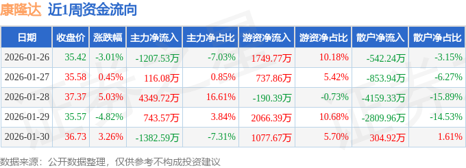 资金流向数据方面,本周康隆达主力资金合计净流入2619.25万元,游资资金合计净流入5441.3万元,散户资金合计净流出8060.55万元。本周资金流向一览见下表: