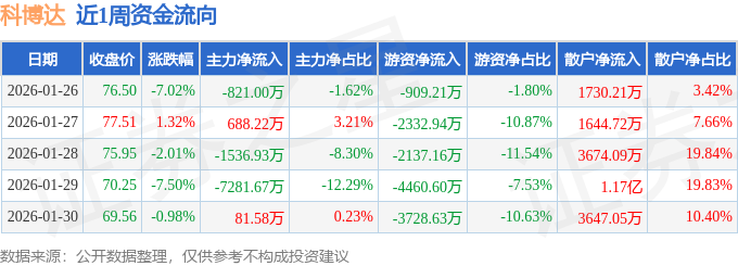资金流向数据方面,本周科博达主力资金合计净流出8869.8万元,游资资金合计净流出1.36亿元,散户资金合计净流入2.24亿元。本周资金流向一览见下表: