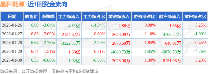 资金流向数据方面,本周晶科能源主力资金合计净流出4.25亿元,游资资金合计净流入3.18亿元,散户资金合计净流入1.07亿元。本周资金流向一览见下表: