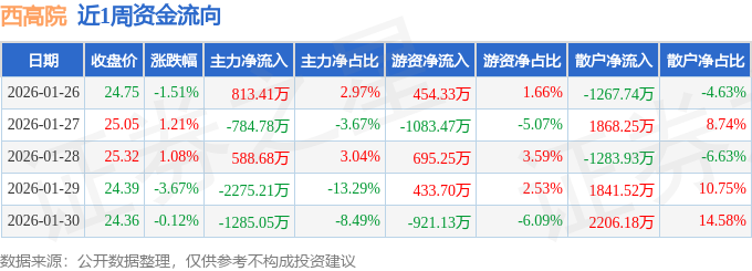 资金流向数据方面,本周西高院主力资金合计净流出2942.95万元,游资资金合计净流出421.33万元,散户资金合计净流入3364.28万元。本周资金流向一览见下表: