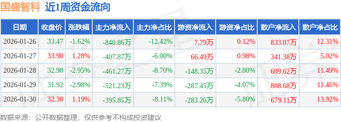 资金流向数据方面,本周国盛智科主力资金合计净流出2627.08万元,游资资金合计净流出644.78万元,散户资金合计净流入3271.85万元。本周资金流向一览见下表: