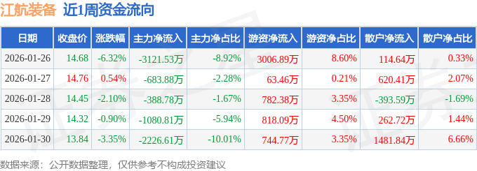 资金流向数据方面,本周江航装备主力资金合计净流出7501.61万元,游资资金合计净流入5415.59万元,散户资金合计净流入2086.02万元。本周资金流向一览见下表: