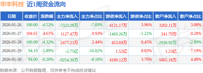 资金流向数据方面,本周华丰科技主力资金合计净流出4.05亿元,游资资金合计净流入2.25亿元,散户资金合计净流入1.8亿元。本周资金流向一览见下表: