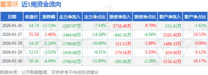 资金流向数据方面,本周霍莱沃主力资金合计净流出1.03亿元,游资资金合计净流入2371.02万元,散户资金合计净流入7919.64万元。本周资金流向一览见下表: