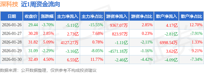 资金流向数据方面,本周深科技主力资金合计净流入1.42亿元,游资资金合计净流出3.01亿元,散户资金合计净流入1.6亿元。本周资金流向一览见下表: