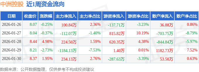 资金流向数据方面,本周中洲控股主力资金合计净流出736.74万元,游资资金合计净流入1012.23万元,散户资金合计净流出275.49万元。本周资金流向一览见下表: