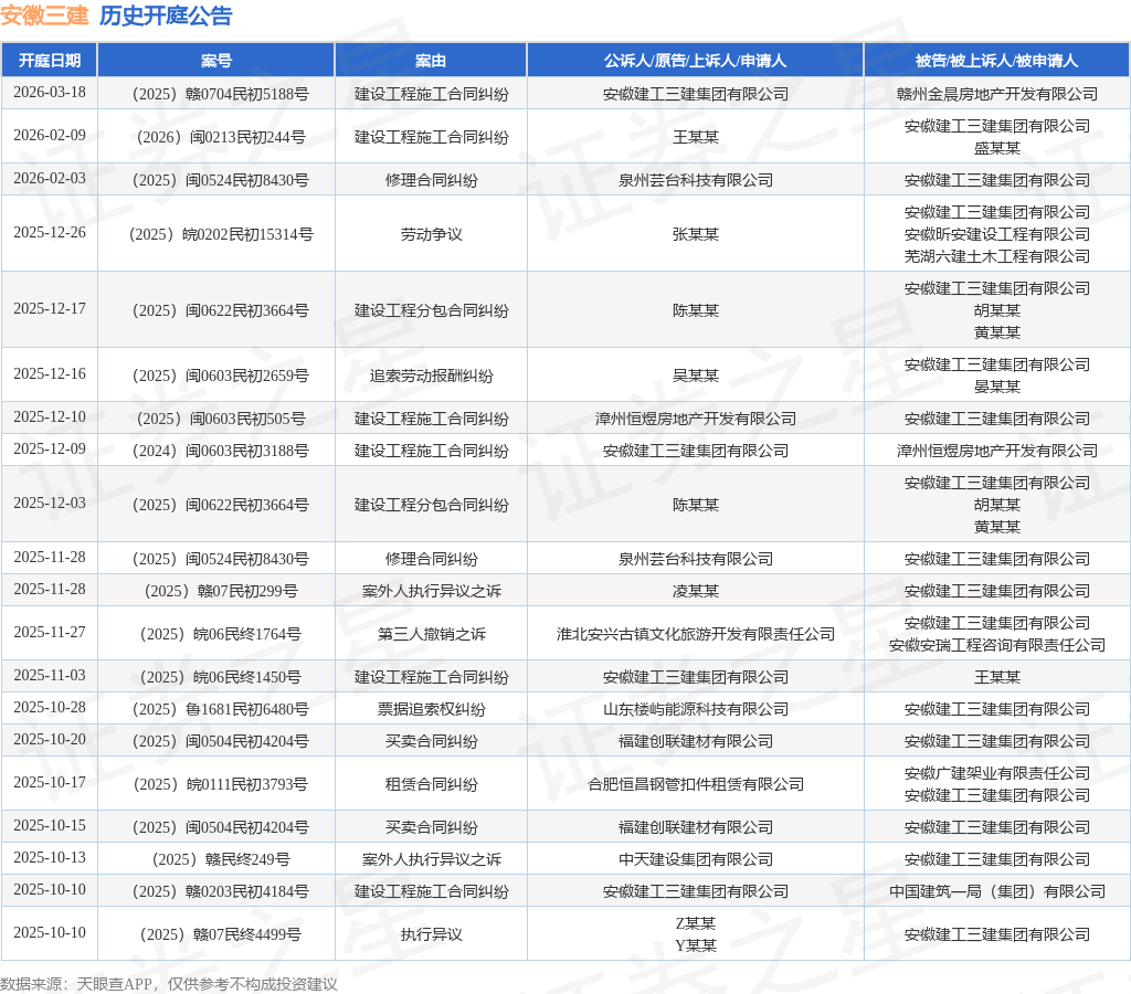 案号:(2025)闽0524民初8430号根据统计,近一年内以安徽建工三建集团有限公司为当事人的历史开庭公告有81则,其中案由为“建设工程施工合同纠纷”的公告以40则居首,其次为“建设工程分包合同纠纷”有6则,“建设工程合同纠纷”有6则。历史开庭公告(前20条)如下: