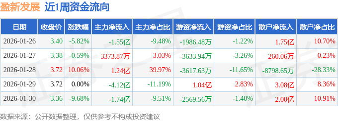 资金流向数据方面,本周盈新发展主力资金合计净流出5.83亿元,游资资金合计净流出1371.56万元,散户资金合计净流入5.97亿元。本周资金流向一览见下表: