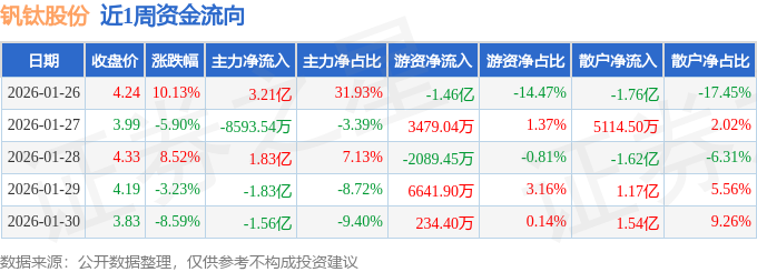 资金流向数据方面,本周钒钛股份主力资金合计净流入7909.59万元,游资资金合计净流出6294.24万元,散户资金合计净流出1615.35万元。本周资金流向一览见下表: